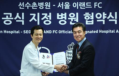 (서울=연합뉴스) 프로축구 2부리그 서울 이랜드FC가 스포츠 재활 전문 병원인 선수촌병원과 공식 후원 계약을 맺었다.