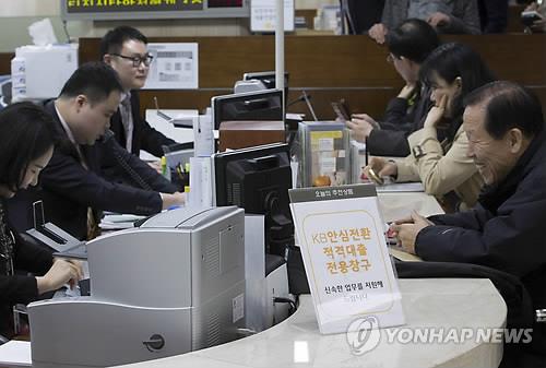 | △ (서울=연합뉴스) 윤동진 기자 = '안심전환대출'이 출시된 24일 오전 서울 여의도 KB은행 본점에서 안심전환대출 가입 희망자들이 전용 창구에서 상담을 받고 있다.16곳 시중은행에서 출시된 안심전환대출은 기존 주택담보대출을 낮은 고정금리의 장기 분할상환대출로 바꿔주며 금리는 연 2% 중반대로 현재 주택담보대출 평균 금리 3.5%보다 1%포인트 정도 저렴하다. 2015.3.24 mon@yna.co.kr |