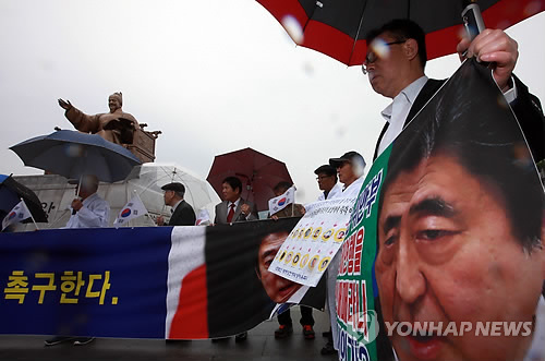 | △ 아베 미 의회 연설 규탄 기자회견 (서울=연합뉴스) 박동주 기자 = 아베 신조 일본 총리의 미국 상하원 합동 연설을 앞둔 29일 태평양전쟁희생자유족회 관계자들이 서울 광화문광장에서 기자회견을 열고 "아베 美의회 연설은 반인권 행위"라며 규탄하고 있다. 2015.4.29 pdj6635@yna.co.kr |