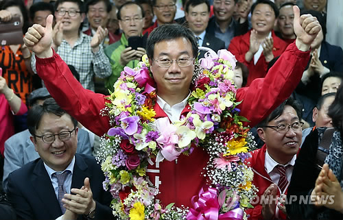 | △ 신상진 후보 당선 확실 (성남=연합뉴스) 신영근 기자 = 경기도 성남 중원 국회의원 보궐선거에서 당선이 확실시 된 새누리당 신상진 후보가 29일 오후 성남시 중원구 중앙동 선거사무소에서 꽃목걸이를 걸고 기뻐하고 있다. |