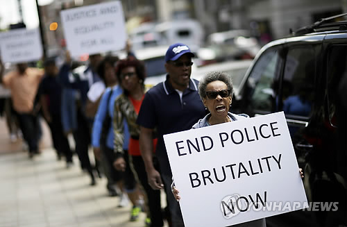 | △ "볼티모어 경찰 폭력 종식하라" (볼티모어 AP=연합뉴스) 흑인에 대한 경찰의 과잉대응을 규탄하는 미국 볼티모어 소요사태가 계속되는 가운데 29일(현지시간) 시위자들이 구금과정에서 숨진 프레디 그레이 사건에 대해 추가 수사를 요구하고 있다. |
