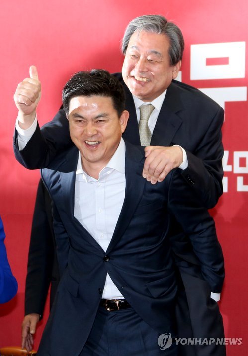 | △ 대표님 수고하셨습니다 (서울=연합뉴스) 백승렬 기자 = 새누리당 김태호 최고위원이 30일 국회에서 열린 최고위원회의에서 선거운동으로 수고한 김무성 대표를 업어주고 있다. 2015.4.30 srbaek@yna.co.kr |