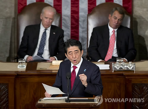 아베 총리는 미 의회 합동연설에서 2차 대전에 대한 반성은 표명했으나 `침략' `사죄' 등의 표현은 쓰지 않았으며 일본군 위안부 문제도 언급하지 않았다.