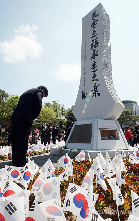 | △ 안중근 장군 추모비 제막 (안성=연합뉴스) 신영근 기자 = 30일 오전 경기도 안성시 유토피아추모관 평화광장에서 안중근평화재단 청년아카데미와 안중근장군추모비건립위원회의 '안중근 장군 추모비 제막행사'가 열려 제막된 추모비 앞에서 참가자들이 헌화 후 묵념하고 있다. 높이 6m, 넓이 3m 크기의 추모비에는 안 의사가 생전에 남긴 글귀 중 하나인 '天堂之福 永遠之樂(천당지복 영원지락·천당의 복이 영원한 즐거움이다)'이 새겨졌다. 2015.4.30 drops@yna.co.kr |