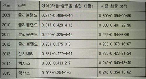 (알링턴=연합뉴스) 장현구 특파원 = 추신수(33·텍사스 레인저스)가 미국프로야구 역대 텍사스 레인저스 타자 가운데 4월 말 기준으로 최저 타율 불명예 기록을 남겼다.