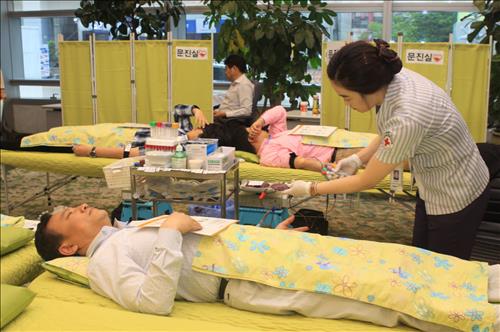 | △ 지난 29일 서울 서초동 삼성물산 본사에서 직원이 헌혈에 참여하고 있다. 삼성물산 제공. |