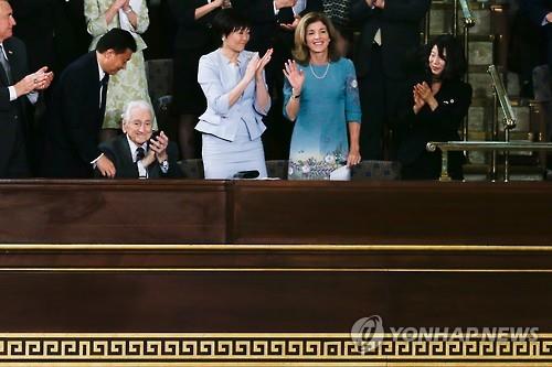 | △ 아베 총리의 미국 상하원 합동 연설 도중 일어나 손을 흔드는 캐롤라인 케네디(손 흔드는 여성) 주일 미국대사와 아베 총리의 부인 아키에(케네디 대사 왼쪽) 여사.(AP=연합뉴스) |