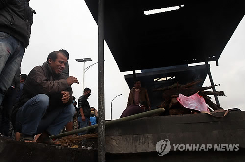 | △ 절망과 슬픔 (카트만두<네팔>=연합뉴스) 신준희 기자 = 30일 오전(현지시간) 네팔 카트만두 파슈파티나트 사원의 힌두교식 화장터. 지난 25일 네팔 북서부에서 발생한 지진 사망자 수레시 수레스타(45)씨의 시신이 힌두교식 장례절차를 거쳐 화장되고 있다. 왼쪽 울고 있는 이는 그의 사촌. hama@yna.co.kr |