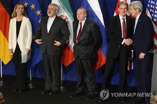 | △ 지난달 2일 스위스 로잔에서 이란 핵협상 잠정 합의안 타결을 발표하고 있는 협상 대표들. 왼쪽부터 페데리카 모게리니 유럽연합(EU) 외교안보 고위대표, 모하마드 자바드 자리프 이란 외교장관, 러시아 측 대표, 필립 해먼드 영국 외교장관, 존 케리 미국 국무장관. 2015.5.1 (EPA=연합뉴스 자료사진) |