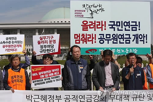 | △ 공적연금강화 대책 수립 촉구 (서울=연합뉴스) 박동주 기자 = 28일 오전 서울 국회 앞에서 공적연금강화 국민행동 등 단체 관계자들이 기자회견을 열고, 공적연금강화 대책 수립을 촉구하고 있다. 2015.4.28 pdj6635@yna.co.kr |