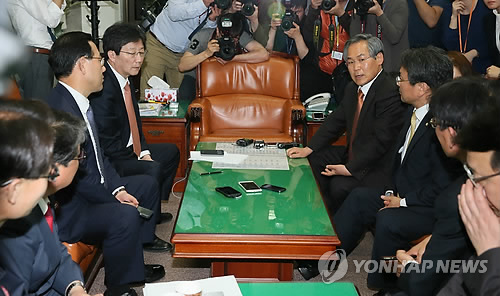| △ 공무원연금개혁 막바지 교섭하는 여야 (서울=연합뉴스) 진성철 기자 = 새누리당 유승민 원내대표와 새정치민주연합 우윤근 원내대표, 주호영 공무원연금개혁특위원장 등이 1일 밤 국회에서 공무원연금개혁방안에 대해 막바지 교섭을 하고 있다. 2015.5.1 zjin@yna.co.kr |