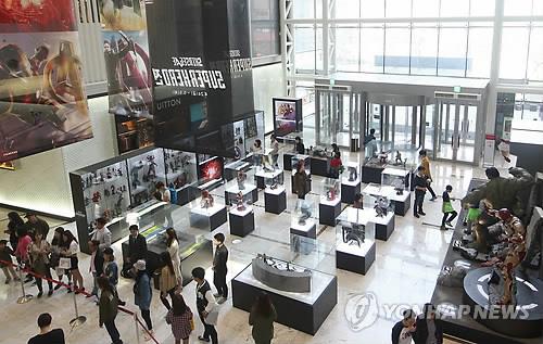 | △ 지난달 26일 오전 서울 영등포구 신세계 백화점 명품관에서 열린 '슈퍼 히어로전'을 찾은 시민들이 헐크, 아이언맨, 캡틴 아메리카 등 다양한 영웅 캐릭터들을 살펴보고 있다. 2015.4.26 |