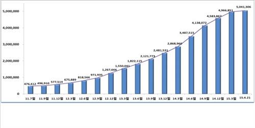 2013년 3월 미래부 출범 당시 155만명이던 가입자수는 업계의 적극적인 노력과 정부의 활성화 정책에 힘입어 월평균 13만8천여명씩 증가, 2년여 만에 3.2배 많은 504만명을 기록했다.