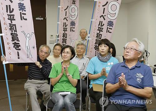| △ 일본 헌법 9조를 노벨평화상 후보로 추천하는 운동을 벌인 일본 시민단체 '헌법 9조에 노벨 평화상을' 실행위원회 관계자들이 2014년 10월 10일 가나가와(神奈川)현 사가미하라(相模原)시에 모여 인터넷 중계를 통해 노벨 평화상 수상자 발표를 지켜보고 있다. (교도=연합뉴스DB) |