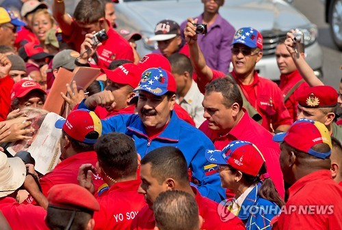 | △ 니콜라스 마두로 베네수엘라 대통령이 지난 1일(현지시간) 노동절 연설에서 최저임금 인상을 결정한뒤 지지자들에게 둘러싸여있다.(AP=연합뉴스DB) |