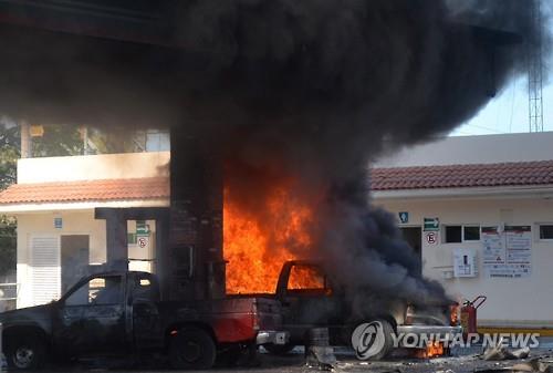 | △ 지난 1일 마약갱단이 멕시코 서부 할리스코 주 주유소에 방화해 차량들이 불에 타고 있다.(EPA=연합뉴스DB) |