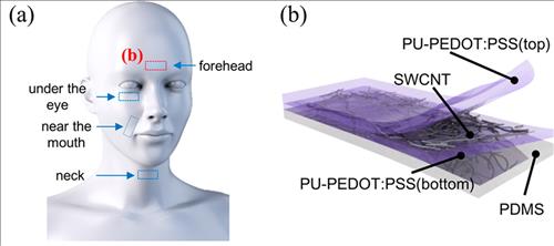 | △ 그림(a) 연구진은 패치형 센서를 얼굴 입 주변과 목, 이마, 눈 아래 등에 부착해 웃거나 우는 감정을 구별하고 눈동자가 움직이는 방향까지 정확히 읽어냈다. 그림(b) 연구진은 투명한 전도성 고분자 탄성체(PEDOT:PSS) 사이에 단일벽탄소나노튜브를 배치한 샌드위치 구조물을 투명하고 신축성이 뛰어난 고분자(PDMS) 기판 위에 부착해 패치형 센서를 만들었다. |