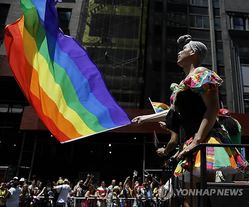 | △ (AP=연합뉴스) 29일(현지시간) 미국 뉴욕에서 레즈비언·게이·양성애자·성전환자(LGBT) 등 '성소수자' 들의 권리를 주장하는 축제인 '게이 프라이드 행진'(Gay Pride Parade)이 열리고 있다. People on a float dance and wave flags during the Gay Pride Parade in New York, Sunday, June 29, 2014. Fifth Avenue became one big rainbow on Sunday, as thousands of participants waving multicolored flags made their way down the street for New York City's annual Gay Pride march. (AP Photo/Seth Wenig) |
