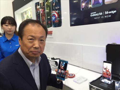 | △ 신종균 삼성전자 무선사업부(IM) 사장이 서울 코엑스몰 삼성전자 전시장을 찾아 영화 어벤져스2 배경화면이 깔린 갤럭시S6를 직접 만져보고 있다. |