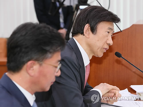 | △ 답변하는 윤병세 장관 (서울=연합뉴스) 진성철 기자 = 윤병세 외교부 장관이 4일 국회 외교통일위원회 전체회의에서 질의에 답변하고 있다. 왼쪽은 홍용표 통일장관. |