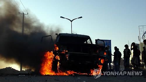| △ 지난달 26일(현지시간) 예멘 아덴에서 후티 반군과 압드라부 만수르 하디 대통령에 충성하는 민병대 간에 충돌이 있은 뒤 반군의 것으로 추정되는 차량이 불에 타고 있다. 2015.5.4 (EPA=연합뉴스) |