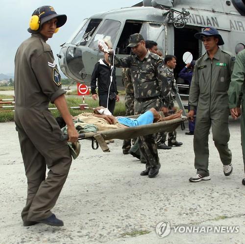| △ 지난달 29일(현지시간) 네팔 카트만두 공항에서 인도공군이 헬기로 부상자를 옮기고 있다.(EPA=연합뉴스DB) |