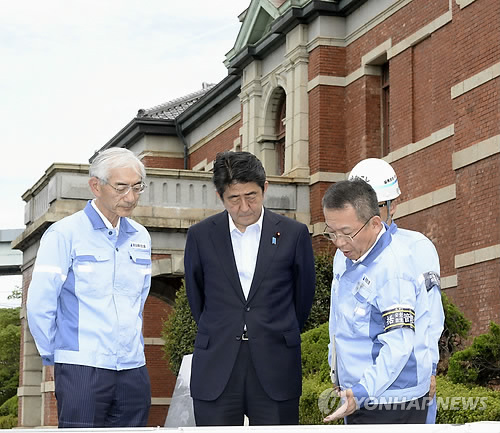 | △ (후쿠오카 교도=연합뉴스.자료사진) 아베 신조(安倍晋三) 일본 총리가 작년 7월 18일 유네스코 세계문화유산 등재를 추진 중인 후쿠오카(福岡)현 기타큐슈(北九州)의 야하타(八幡)제철소를 방문했을 때 모습. 야하타제철소 유적 등은 일본에게 자국 근대화의 상징적 공간이지만 한국처럼 식민지배를 당한 주변국들에게는 강제 징용당한 선조들의 고난사가 새겨진 장소여서 한국 정부는 유네스코 세계유산으로 등록하려는 일본 정부의 방침이 구체화한 작년 9월 외교경로를 통해 일측에 항의한 바 있다. |
