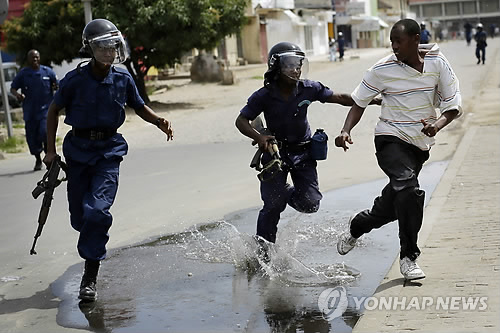 | △ 부룬디 대통령 3연임 반대 시위 '너 이리와' (부줌부라 AP=연합뉴스) 대통령 3연임에 반대하는 부룬디 시민 수 천 명이 4일(현지시간) 수도 부줌부라에서 반정부 시위를 재개한 가운데 시위 진압 경찰이 시위대를 뒤쫓아가 붙잡으려 하고 있다. kjw@yna.co.kr |