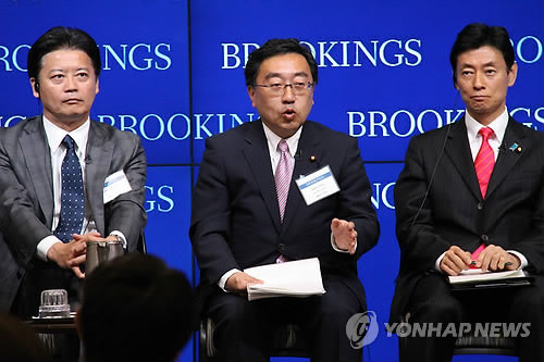 | △ (워싱턴=연합뉴스) 심인성 특파원 = 4일(현지시간) 워싱턴DC 브루킹스연구소에서 열린 '미일 관계의 장래' 세미나에 참석한 일본 제1야당인 민주당의 겜바 고이치로(왼쪽) 의원과 아베 총리의 측근 중 한 명인 니시무라 야스토시 일본 내각 부대신(오른쪽). 2015.5.5 sims@yna.co.kr |