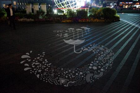 (서울=연합뉴스) 황희경 기자 = 평소에는 안보이다가 비가 오거나 물이 묻을 때만 나타나는 미술작품인 '레인웍스'(Rainworks)가 서울광장에 등장했다.