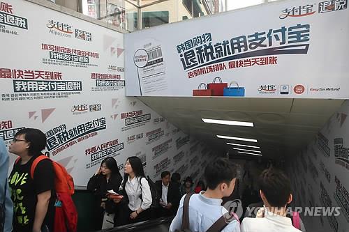 | △ (서울=연합뉴스) 김주성 기자 = 중국 노동절을 앞둔 4월 26일 서울 중구 명동의 지하쇼핑몰 계단에 중국 관광객을 위해 세금 환급 서비스를 알리는 문구가 붙어 있다. 2015.4.26 utzza@yna.co.kr |