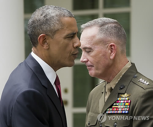 | △ '당신 임무는..알았죠?' 신임 美합참의장 (워싱턴 AP=연합뉴스) 버락 오바마 미국 대통령이 5일(현지시간) 백악관 로즈가든에서 조지프 던포드 주니어 해병사령관을 합참의장에 임명한 뒤 귀엣말을 하고 있다. kjw@yna.co.kr |
