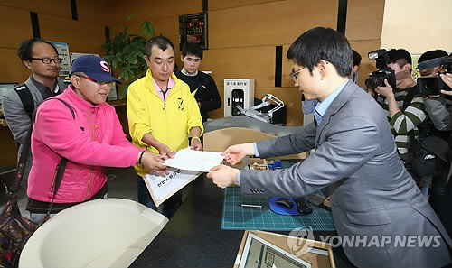 | △ 경찰 최루액 대포 사용 헌법소원 청구 (서울=연합뉴스) 한종찬 기자 = 세월호 특별조사위원회 시행령이 국무회의를 통과한 6일 세월호 유가족들이 경찰의 최루액 대포 사용에 관한 헌법소원 청구서를 들고 서울 종로구 재동 헌법재판소에 접수하고 있다 . 2015.5.6 saba@yna.co.kr |