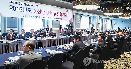 | △ 경기도-새누리당 경기도당 당정협의회 (서울=연합뉴스) 6일 오전 서울 여의도 렉싱턴호텔에서 열린 '경기도-새누리당 경기도당' 당정협의회가 남경필 경기도지사 등이 참석한 가운데 열리고 있다. 2015.5.6 <<경기도 제공>> hedgehog@yna.co.kr |