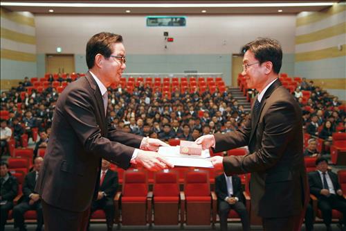 | △ 한국가스안전공사가 6일 충북혁신도시 본사에서 '2015년 KGS 전문인 임명장 수여식을 개최했다.(왼쪽 박기동 가스안전공사 사장) |