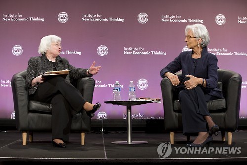 | △ (AP=연합뉴스) 재닛 옐런 미국 연방준비제도 의장(왼쪽)과 크리스틴 라가르드 국제통화기금(IMF) 총재가 6일(현지시간) 워싱턴DC에서 열린 '금융과 사회' 토론회에서 대화하고 있다. |