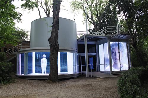9일 공식 개막에 앞서 이날 많은 국가관이 자국 작품을 공개했지만 한국관은 외부에서 관람객이 영상을 볼 수 있도록 설치해 관람객의 눈길을 끌었다.