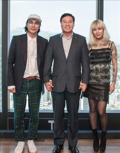 | △ SK네트웍스 문종훈 사장이 '스티브J&요니P' 인수 계약 직후 '스티브J&요니P'의 정혁서, 배승연 디자이너와 기념촬영을 하고 있다. |