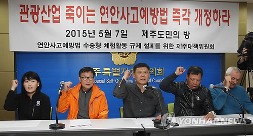 제주지역 스쿠버 업계 관계자로 구성된 연안사고예방법 수중형 체험활동 규제 철폐를 위한 제주대책위원회는 7일 제주도의회 도민의 방에서 기자회견을 열어 "연안사고예방법 시행규칙 제2조 2항을 삭제해 스쿠버다이빙을 연안 체험활동에서 제외해야 한다"고 주장했다.