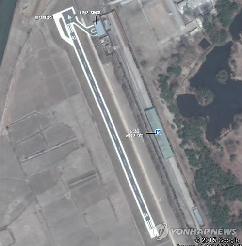 구글어스가 지난 3월26일 촬영한 강원도 원산 해안의 위성사진에는 김정은 제1위원장의 전용 별장 인근에 기존의 전용 기차역과 나란히 길이 550m, 폭 15m 규모로 북서 방향으로 뻗은 새 활주로가 들어선 것이 보인다.