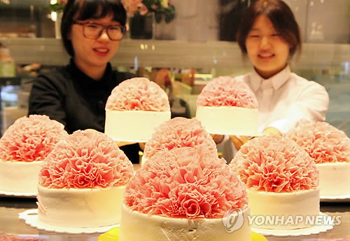 | △ 카네이션 케이크 (부산=연합뉴스) 어버이날을 하루 앞둔 7일 부산시 해운대구 신세계 센텀시티 지하1층에서 5월 가정의 달을 맞아 카네이션 꽃모양 케이크를 선보이고 있다. 2015.5.7 << 신세계 센텀시티 >> ccho@yna.co.kr |