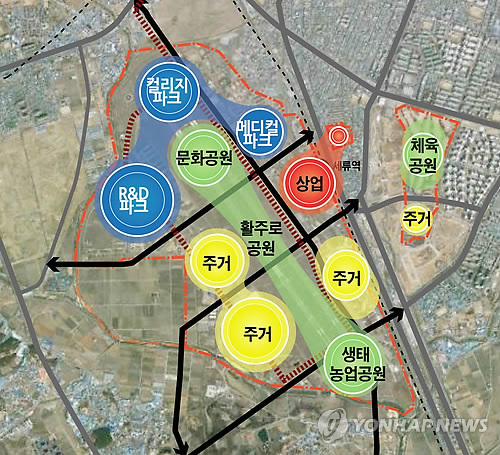 | △ 수원공군비행장 개발 계획도 (수원=연합뉴스) 수원시가 마련한 공군비행장 개발 계획도. 시는 수원비행장(525만㎡)의 56.5%를 공원과 도시기반시설로 존치하고 나머지 43.5%(228만㎡)를 분양, 4조5천억원을 재원을 마련할 계획이다. 2014.3.26 <<수원시 제공>> kcg33169@yna.co.kr |