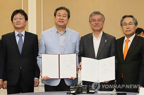 | △ 지난 2일 국회에서 '공무원연금 개혁 및 국민연금 강화를 위한 양당 대표 합의문'을 발표하고 있다. (연합뉴스 자료사진) |