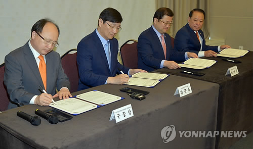 | △ (부산=연합뉴스) 미래창조과학부, 부산시, 부산콘텐츠마켓(BCM) 조직위원회, 한국전파진흥원은 8일 오전 벡스코에서 '아시아 디지털방송 아카데미 설립을 위한 상호협력 양해각서'를 교환했다. 왼쪽부터 구종상 BCM 조직위원장, 김규옥 부산시 경제부시장, 최재유 미래부 2차관, 강철희 한국전파진흥협회 상근부회장. 2015.5.8 <부산콘텐츠마켓 조직위> ccho@yna.co.kr |