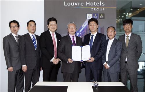 | △ 왼쪽부터 랜드마크씨앤디㈜ 윤석호 이사, 랜드마크씨앤디㈜ 민지홍 부사장, 랜드마크씨앤디㈜ 김민수 대표, 루브르호텔그룹 필리아스 로우(Phileas Law) 골든튤립 중국지사 수석부회장, ㈜트리플인베스트 표종민 대표, ㈜트리플인베스트 오태형 전무이사, ㈜트리플인베스트 이영우 이사 순 |