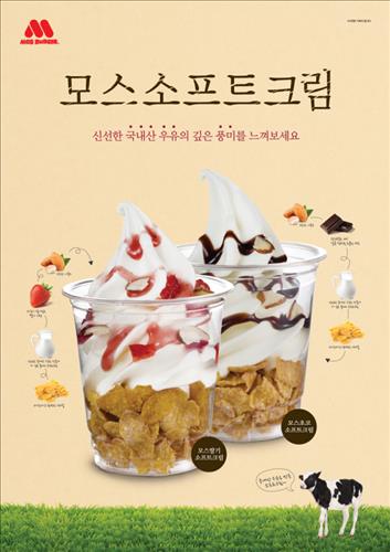 이들 제품은 국내산 우유와 부드러운 생크림으로 만든 플레인 모스소프트크림에 각각 딸기 시럽과 초코시럽을 곁들인 뒤 아몬드 슬라이스와 시리얼을 더한 제품이다.