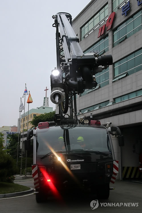 | △ 패널 뚫고 불 끄는 특수장비 시연 (부산=연합뉴스) 오수희 기자 = 부산시소방안전본부는 11일 오전 부산시 연제구 안전본부 마당에서 건물 패널을 뚫고 불을 끄는 '무인파괴 방수탑차' 시연회를 열었다. 2015.5.11 osh9981@yna.co.kr |