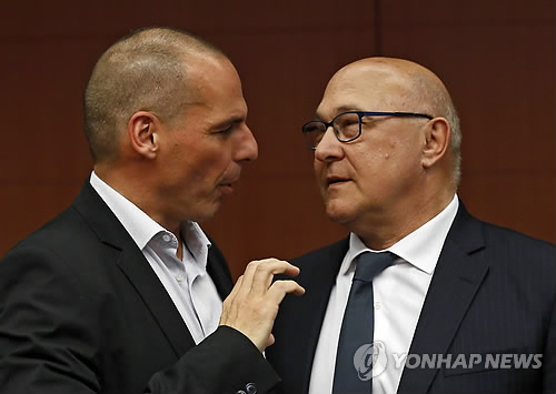 | △ 유로그룹, 그리스 구조개혁 '평가' (브뤼셀 EPA=연합뉴스) 야니스 바루파키스 그리스 재무장관(왼쪽)과 미셸 사팽 프랑스 재무장관이 11일(현지시간) 벨기에 브뤼셀의 유로그룹(유로존 재무장관 협의체) 회의에서 대화하고 있다. |