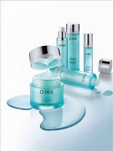 '오휘 미라클 아쿠아' 5종은 스킨 소프너(150㎖, 3만8천원대), 에멀전(130㎖, 4만원대), 에센스(45㎖, 6만3천원대), 젤크림(50㎖ 6만원대), 미스트(50㎖·2개, 3만원대)로 구성돼 있다.
