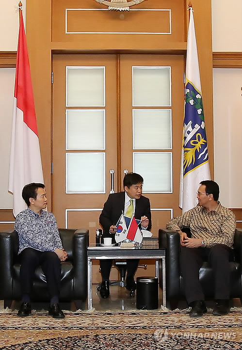 | △ 이야기 나누는 남경필 지사와 자카르타 주지사 (자카르타=연합뉴스) 아세안(ASEAN)시장개척과 청년일자리 창출 방안 마련을 위해 인도네시아를 방문 중인 남경필 경기도지사가 12일 오전 인도네시아 자카르타시에 위치한 자카르타 주정부청사에서 바수키 차하야 푸르나마 자카르타 주지사와 양 지역 간 교류협력 방안에 대해 대화를 나누고 있다. 2015.5.12 <<경기도청>> you@yna.co.kr |